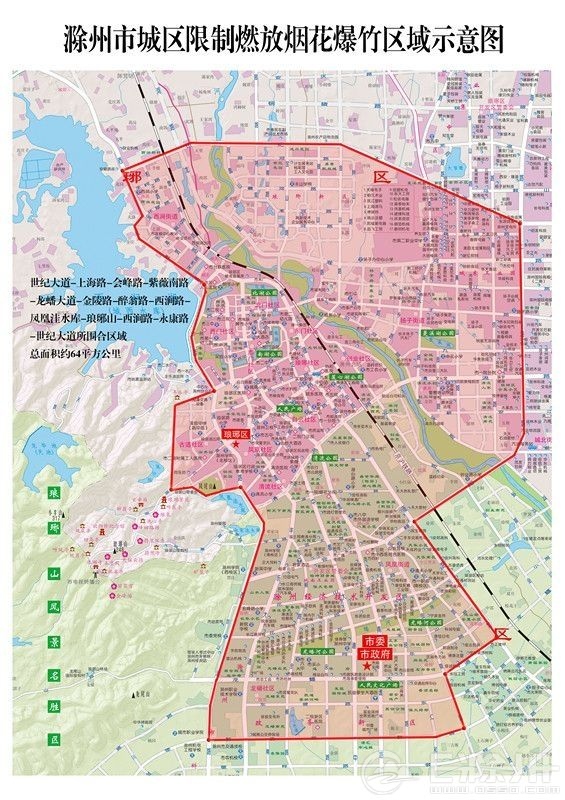 城區(qū)限制燃放煙花爆竹區(qū)域?yàn)椋骸笆兰o(jì)大道—上海路—會(huì)峰路—紫薇南路—龍?bào)创蟮馈鹆曷贰砦搪贰鳚韭贰P凰洼水庫(kù)—瑯琊山—西澗路—永康路—世紀(jì)大道”所合圍區(qū)域。