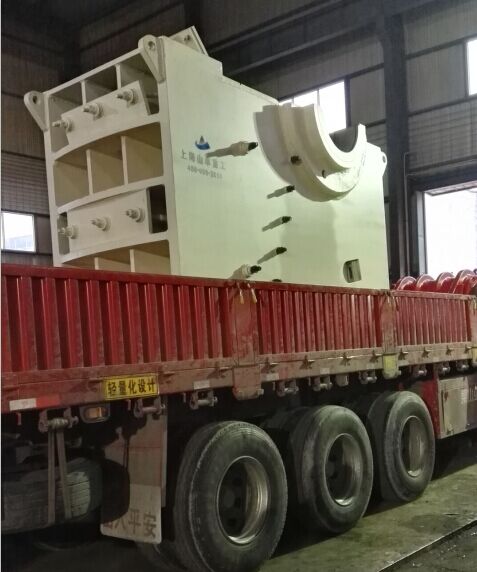 這是上周上海山卓重工的顎式破碎機的發貨現場,這一臺設備是發往貴州六盤水的。這些照片都是小編用自己的手機隨手拍的,雖然光線不是很好,但也可以清晰的看到設備上我們上海山卓的標志。這臺鄂破的型號是PE900*1200,屬于一個比較大的型號,它的進料口尺寸是900mm*1200mm,確實是一臺很大的設備!